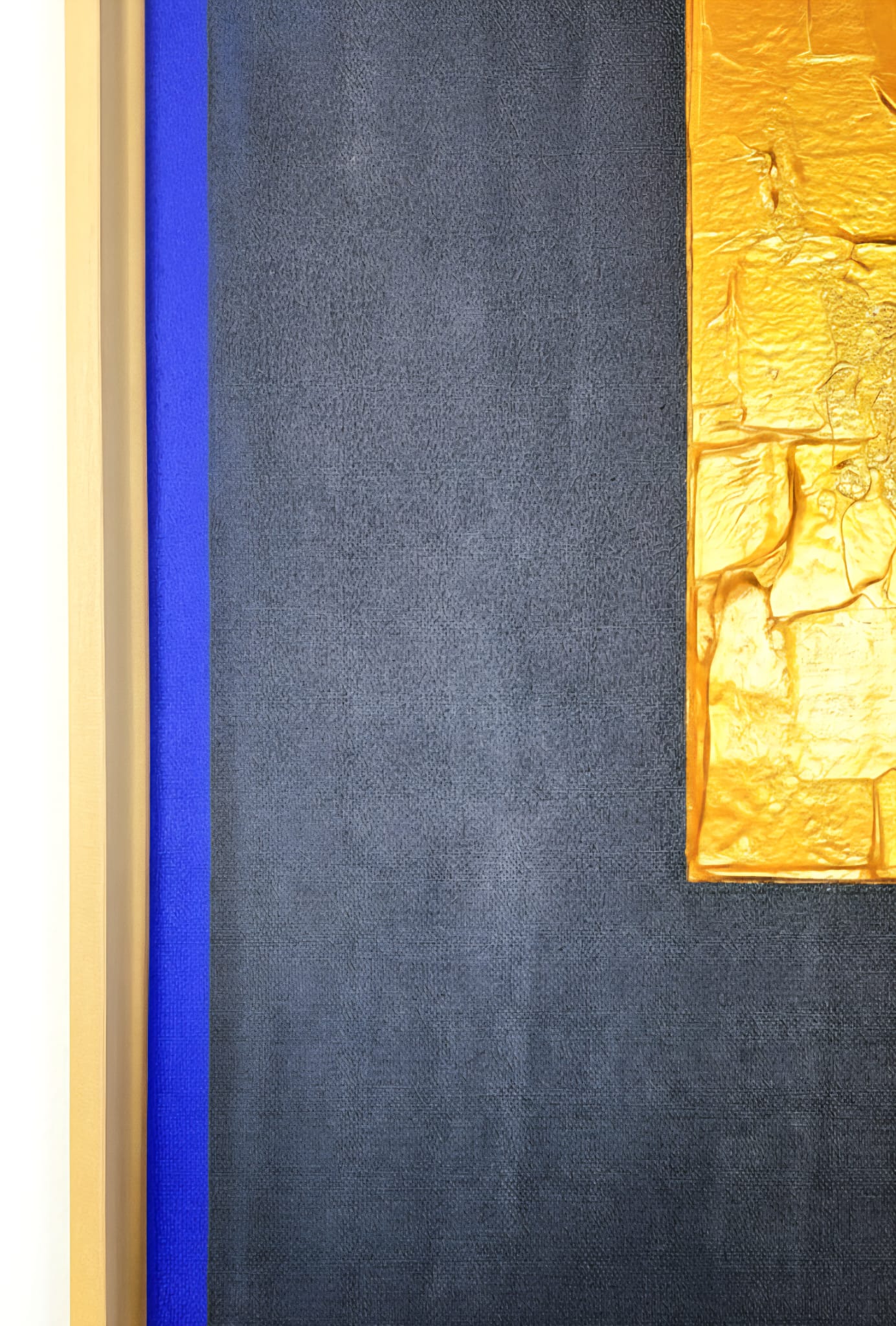 Framed Moonlight toont een marineblauwe rechthoek met daarin een strakke, maar gelaagde gouden rechthoek die scherp contrasteert met de diepe donkerblauwe ondergrond. Het werk vangt het beeld van het felle licht van een volle maan dat door een dakraam valt en benadrukt het contrast tussen het gouden accent en de rustige, nachtelijke achtergrond. Het stralende maanlicht vormt een krachtig visueel middelpunt in de compositie.